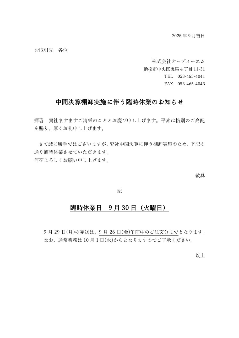中間決算棚卸実施に伴う臨時休業のお知らせ